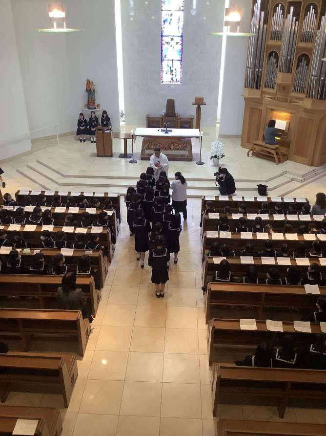 学園の聖堂で、全校児童が一堂に会し、お祈りをします。日々のお祈りと同様に他者への思いやり、家族や隣人への感謝の気持ち、つらい日々を送っている人々へ思いを馳せます。