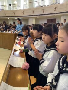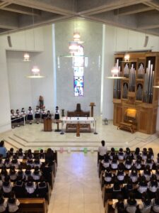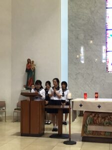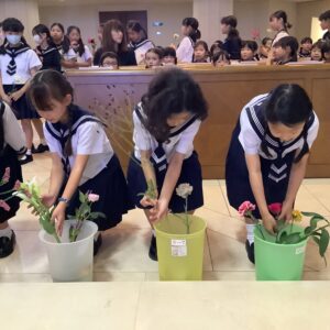 日差し若干強めの本日、マリア様祈りの集いが1時間目にありました。みんなで持ち寄ったお花をマリア様に捧げて、お祈りをしました。