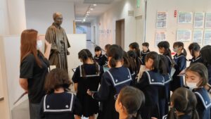 最初に河北新報創業者の一力健治郎氏の銅像の前で説明を聞きました。