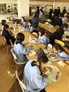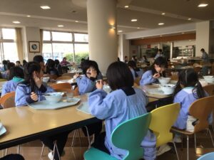 本日は、3・4年生合同のランチ会です。併設の中学高等学校の食堂「ステラマリス」に行って好きなものを食べました。もちろん券売機に並んで自分で券を購入しました。